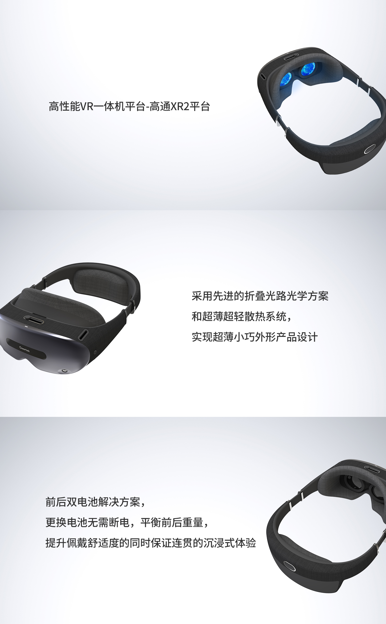 基于高通骁龙XR2平台的VR一体机参考设计,采用折叠光路光学方案实现超薄小巧外形产品设计,为消费者和企业用户提供沉浸式体验