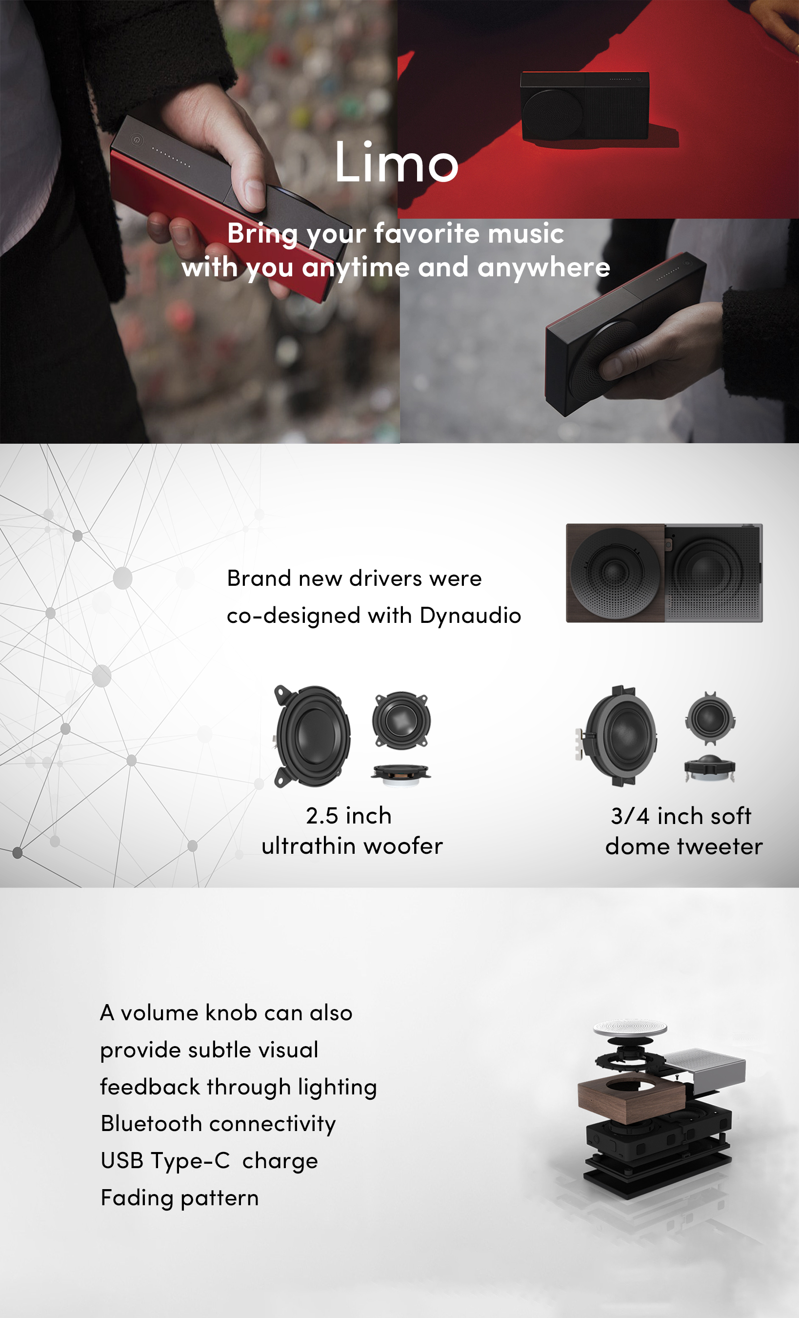 By marrying construction, form, and functionality, Limo is a wireless, portable speaker created for a mobile lifestyle. It was designed with young customers in mind 99视频精品全部在线. Its drivers which co-designed with Dynaudio help Limo to reproduce outstanding sound performance and maintain its slim size.